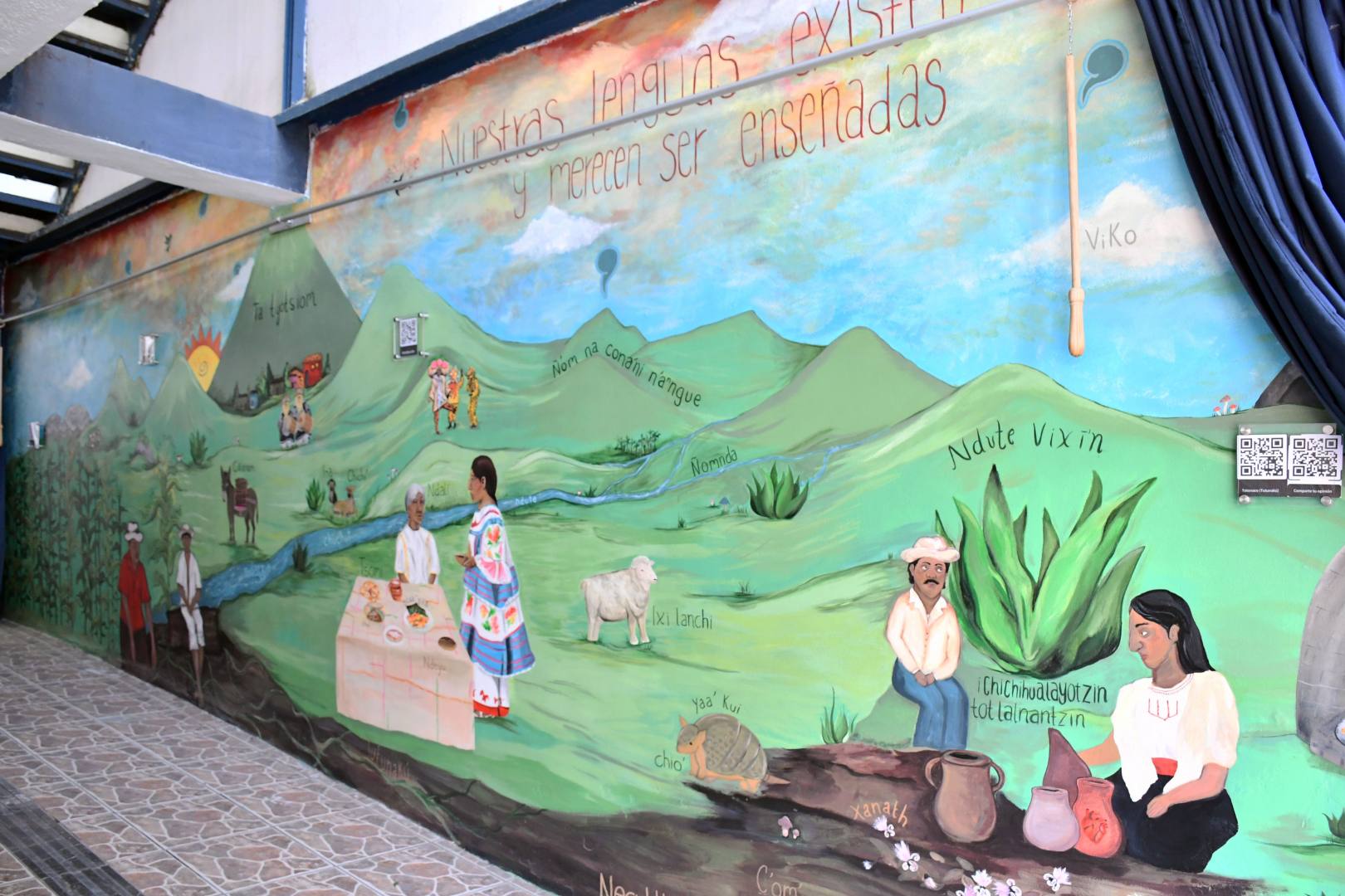 Se inauguró también en esta unidad académica el mural “Paisaje lingüístico interactivo de lenguas originarias”, realizado por alumnos de la Facultad de Artes Plásticas y Audiovisuales, el cual visibiliza a las voces nativas desde la cotidianidad de las acciones con gente trabajando, compartiendo comida y conviviendo.