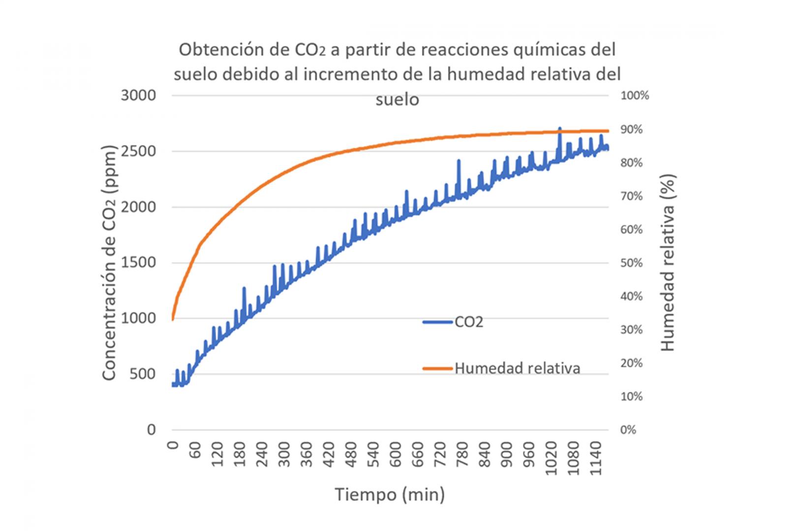 “También la humedad al interior de la cámara se incrementó de 33.1 a 89.5 por ciento en un intervalo de 19 horas; esto se debe a la reacción química entre el agua y CO2 de la atmósfera del sistema produciendo ácido carbónico, el cual entra en contacto con el carbonato de calcio presente en el sustrato y da como resultado una reacción en la que se obtiene una mayor cantidad de CO2 al interior de la cámara. Con estos datos se comprueba el aumento de la humedad relativa y el CO2 conforme transcurre la noche”, expuso el académico.