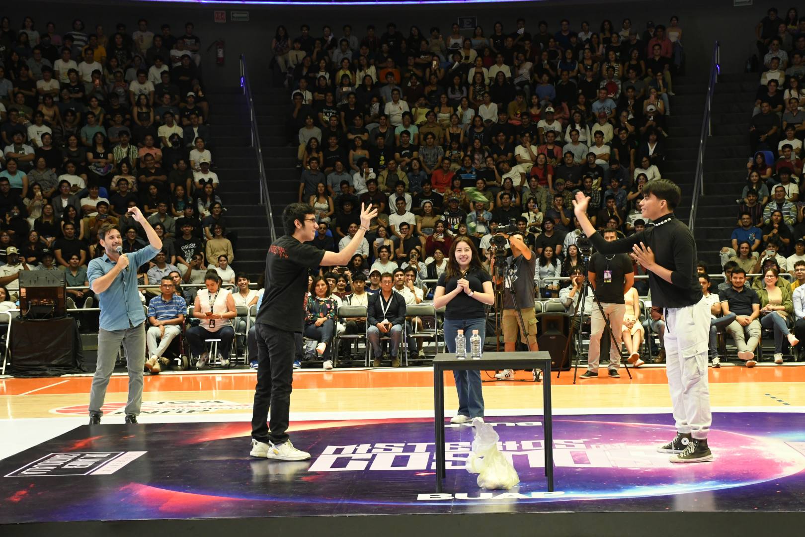 En su conferencia “Misterios del cosmos”, impartida ante cientos de estudiantes de Física, Ingeniería, Biología, Matemáticas y Química, por citar algunos, el doctor en Física de Partículas y autor del canal Date un Vlog en Youtube con 2 millones de suscriptores, expuso que dichos enigmas igualmente están relacionados con la simetría, masa y materia y la energía oscura -éstos últimos representan el 96 por ciento del cosmos. Asimismo, con un ejemplo, mostró cómo se desarrolla un choque de partículas en el Gran Colisionador de Hadrones (LHC) del CERN.