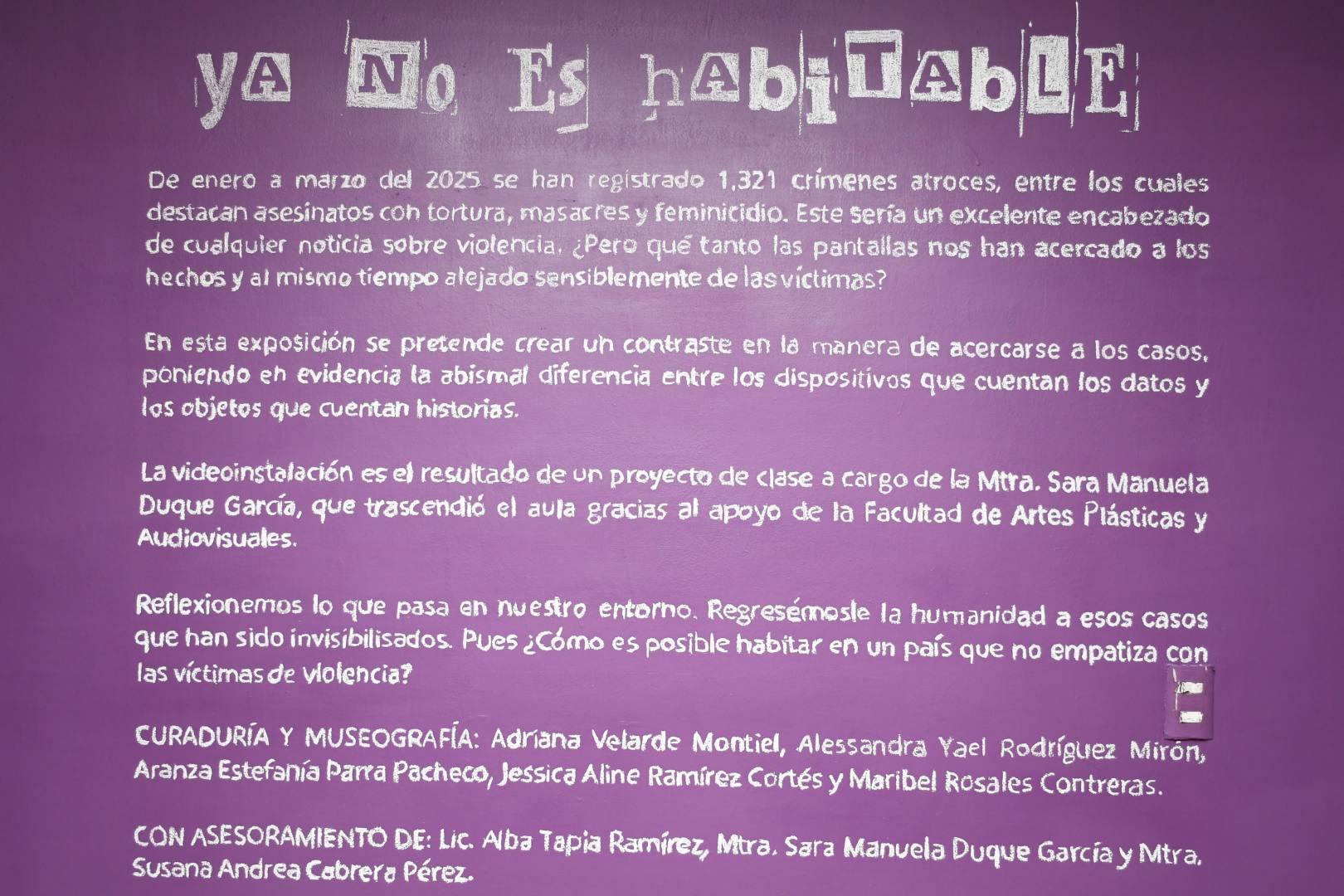 “Ya no es habitable” es el título de la exposición de cinco estudiantes de la Facultad de Artes Plásticas y Audiovisuales (FARPA), quienes a través de una videoinstalación visibilizan la violencia de los últimos años en el país; en particular, exponen 12 casos que van desde la delincuencia e inseguridad en las calles, hasta situaciones de tortura y homicidio.