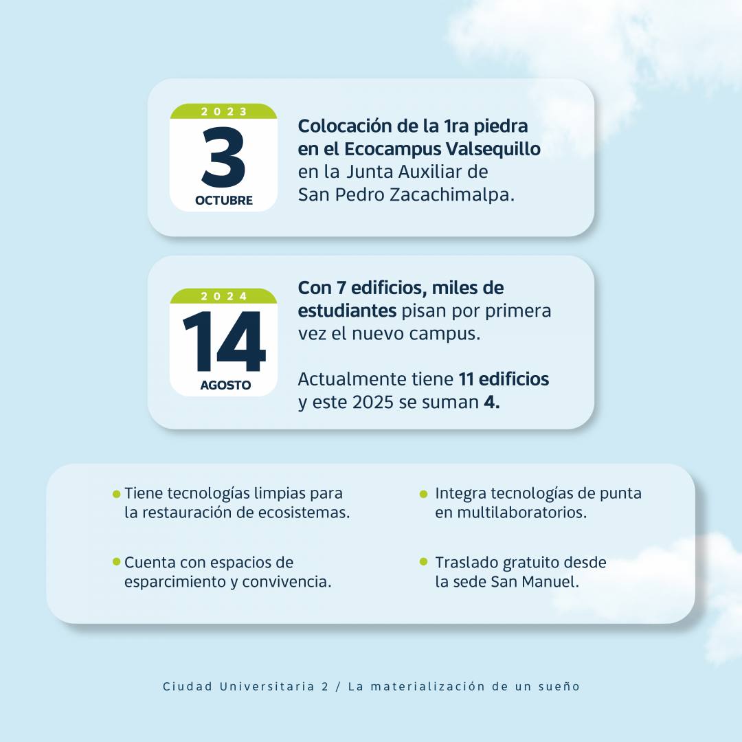 CU2 es la materialización de un sueño que inició el 3 de octubre de 2023, con la colocación de la primera piedra en el Ecocampus Valsequillo. La mirada visionaria de la Rectora Lilia Cedillo Ramírez, con el apoyo del gobierno estatal, permitió que miles de estudiantes pisaran por primera vez el nuevo campus el 14 de agosto de 2024, constituido en una primera etapa por siete edificios: aulas y laboratorios, espacios administrativos, biblioteca y cubículos para docentes, entre otras áreas.