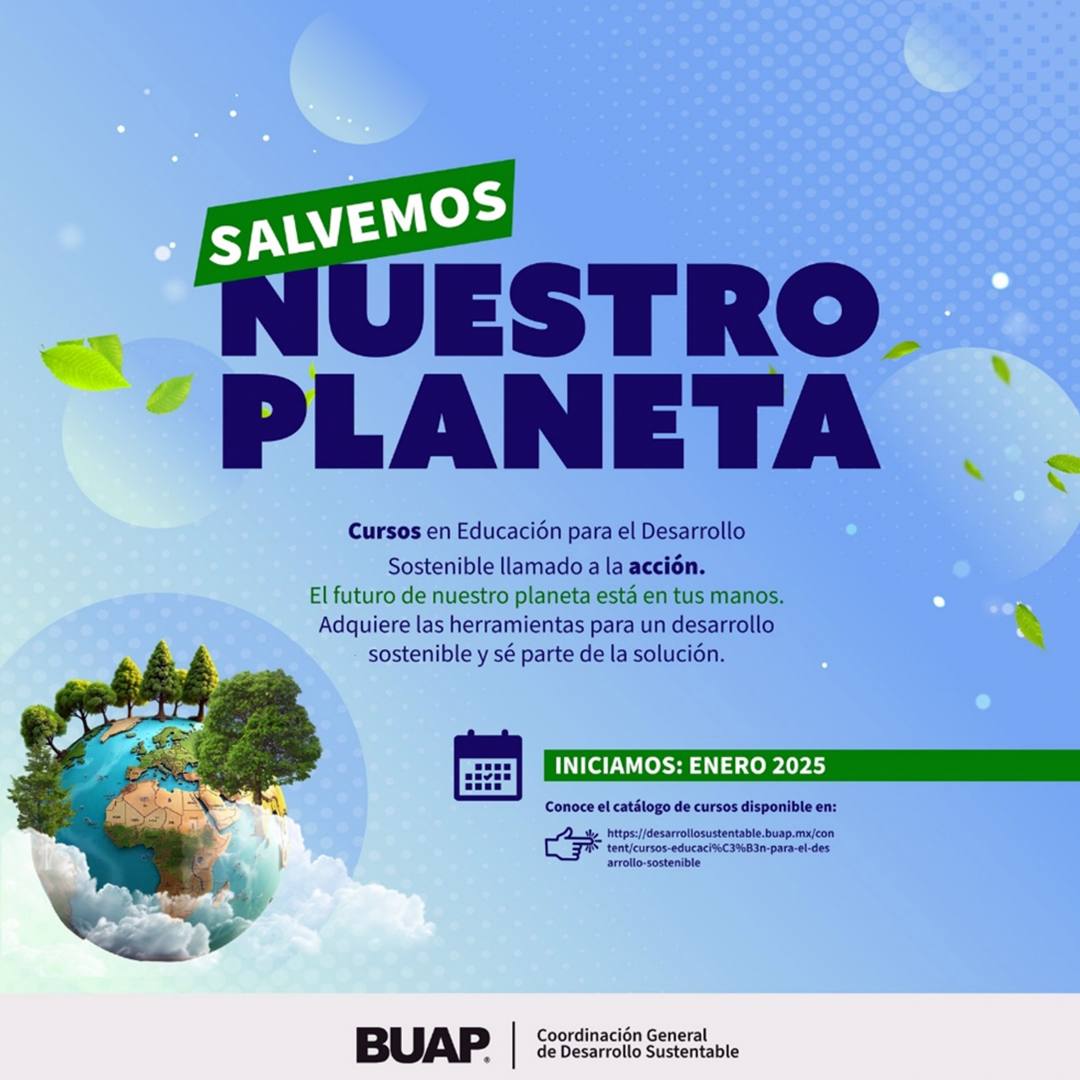 Con el propósito de brindar recursos educativos accesibles y de alta calidad, enfocados en la protección del planeta, a través de la Coordinación de Gestión Ambiental de la Coordinación General de Desarrollo Sustentable, la BUAP lanzó la plataforma educativa ambiental: “Llamado a la acción: Salvemos nuestro planeta”, a través de la cual se ofertarán cursos digitales en la materia durante 2025.