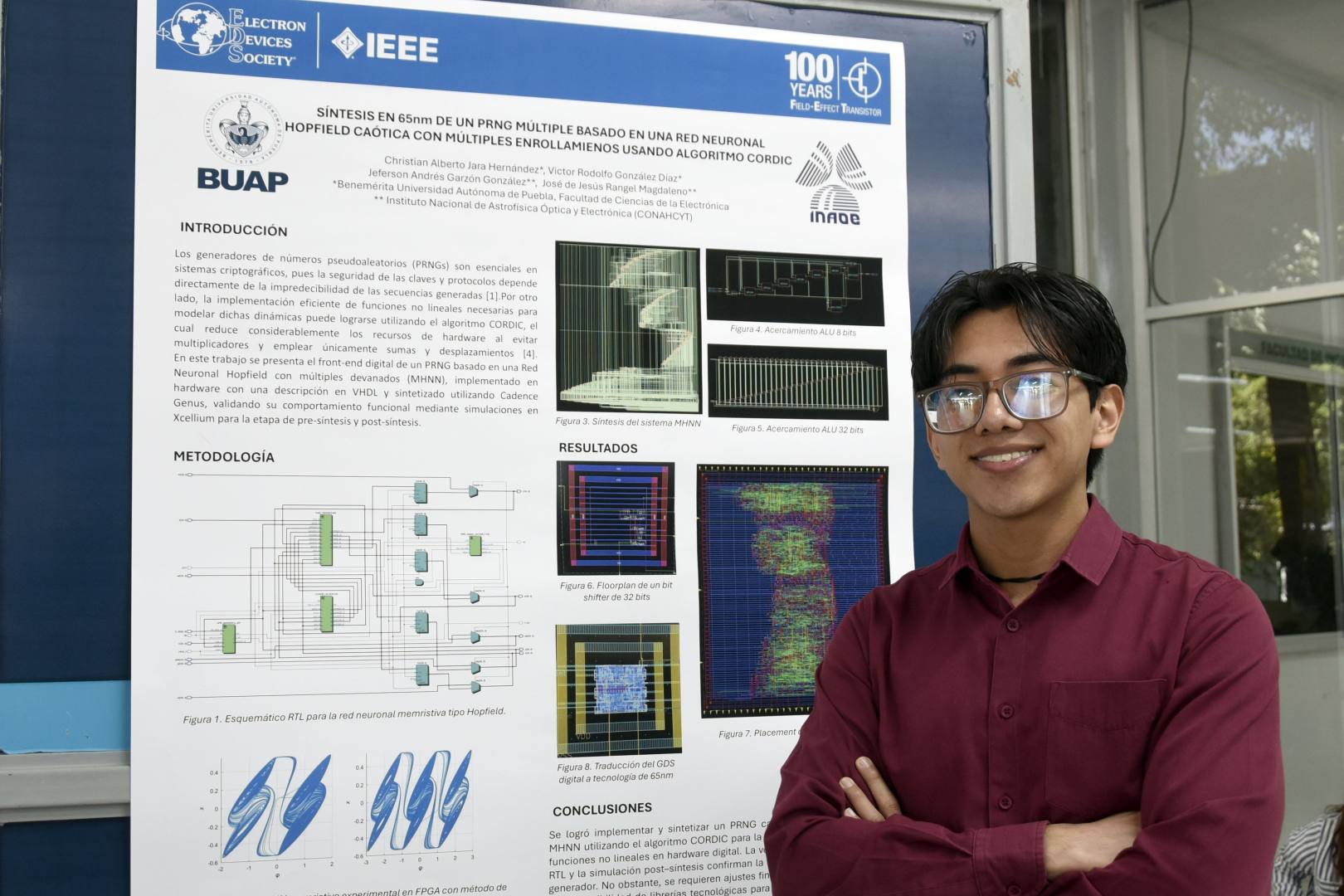Por su parte, Christian Jara Hernández, estudiante y presidente del capítulo estudiantil EDS —impulsado por el doctor Víctor González del Laboratorio de Diseño y Caracterización de Circuitos y Sistemas de la Facultad de Ciencias de la Electrónica—, presentó la síntesis de un generador de números aleatorios, en colaboración con el INAOE (Instituto Nacional de Astrofísica, Óptica y Electrónica).