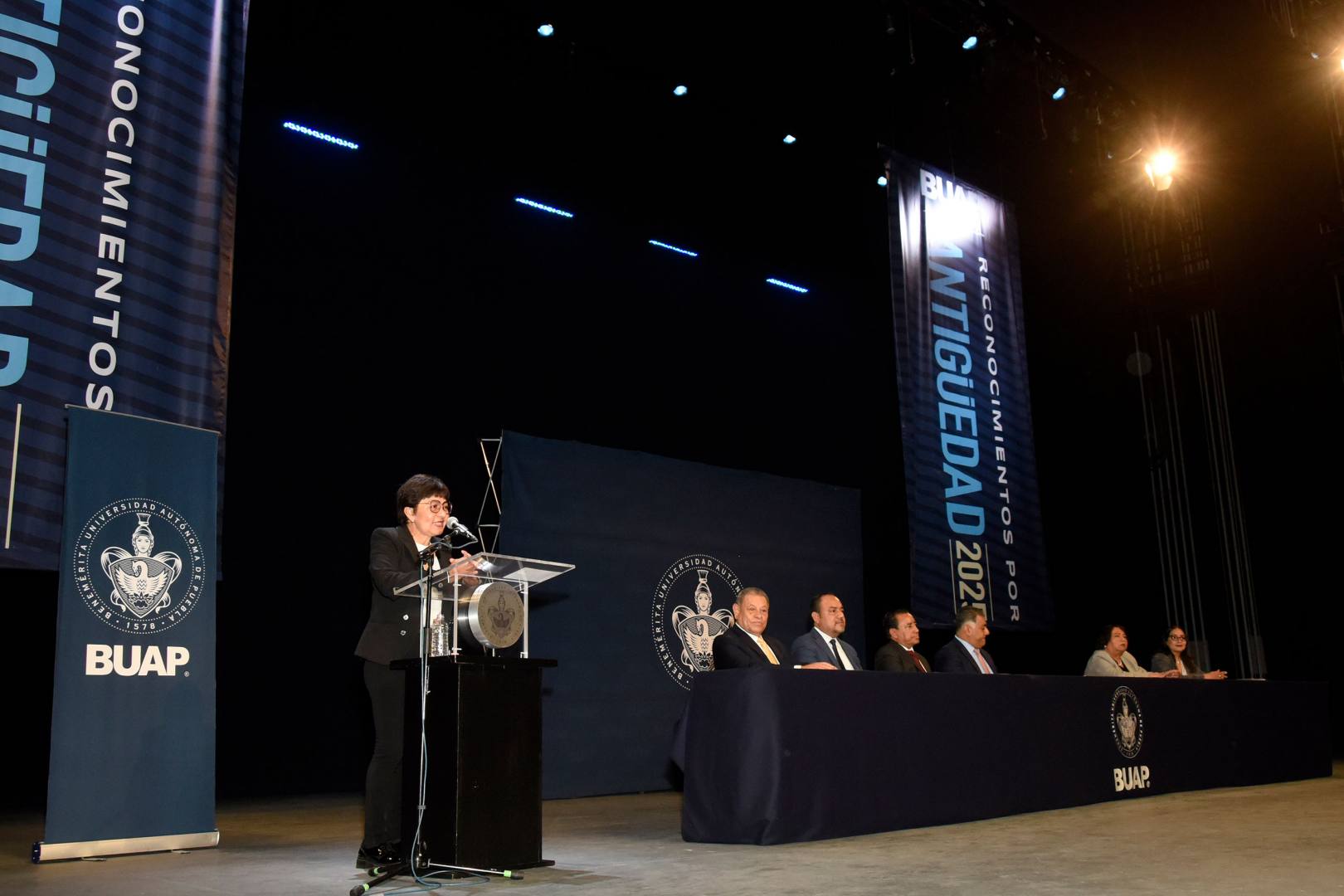 La solidez de la BUAP radica en sus académicos y trabajadores administrativos, porque “son quienes sostienen y hacen fuerte a la institución; entregan su vida y le dedican más horas, incluso que a su propia familia”, expresó la Rectora Lilia Cedillo Ramírez, en la entrega de reconocimientos por antigüedad a 430 docentes y 248 del personal administrativo, por sus 20, 25, 30, 35, 40, 45, 50 y 55 años de labor en la institución.