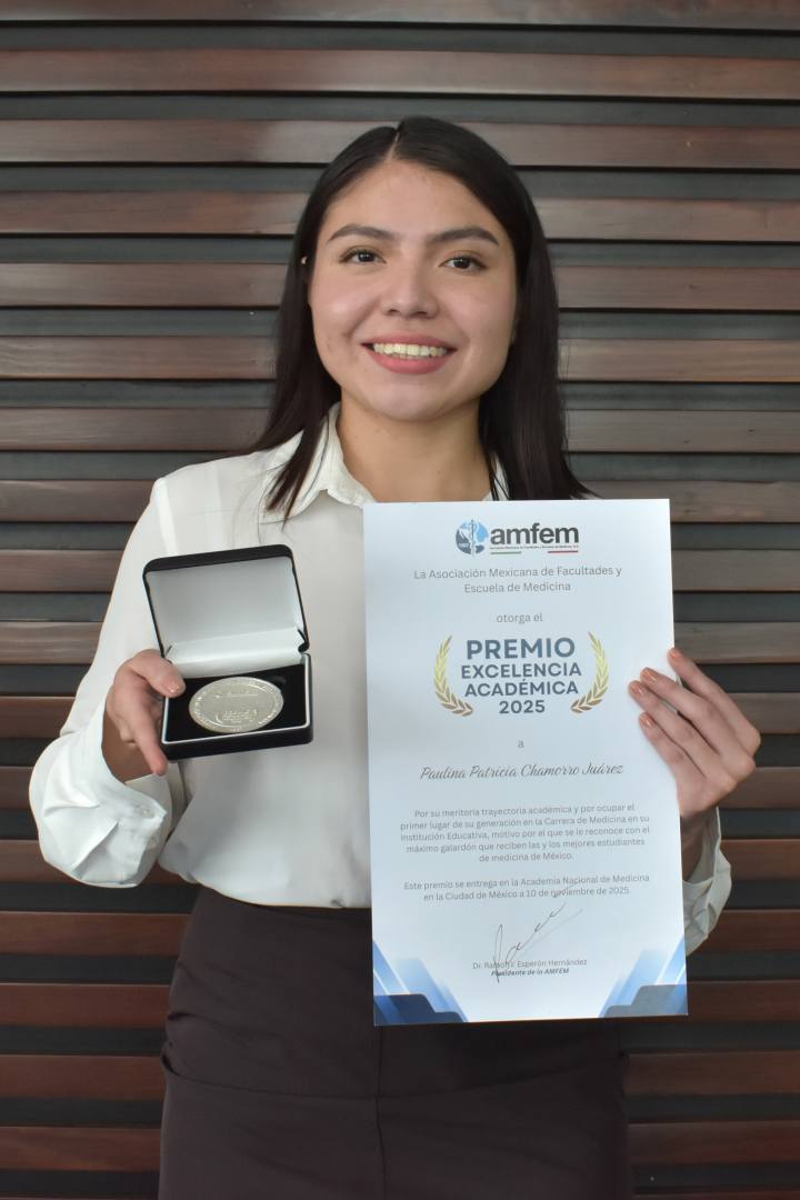 Paulina Patricia Chamorro Juárez, pasante de la Facultad de Medicina de la BUAP, fue reconocida con el Premio a la Excelencia Académica 2025 otorgado por la Asociación Mexicana de Facultades y Escuelas de Medicina (AMFEM), organismo que reconoce a los promedios más altos de las instituciones afiliadas. En esta edición fueron premiados 103 estudiantes.