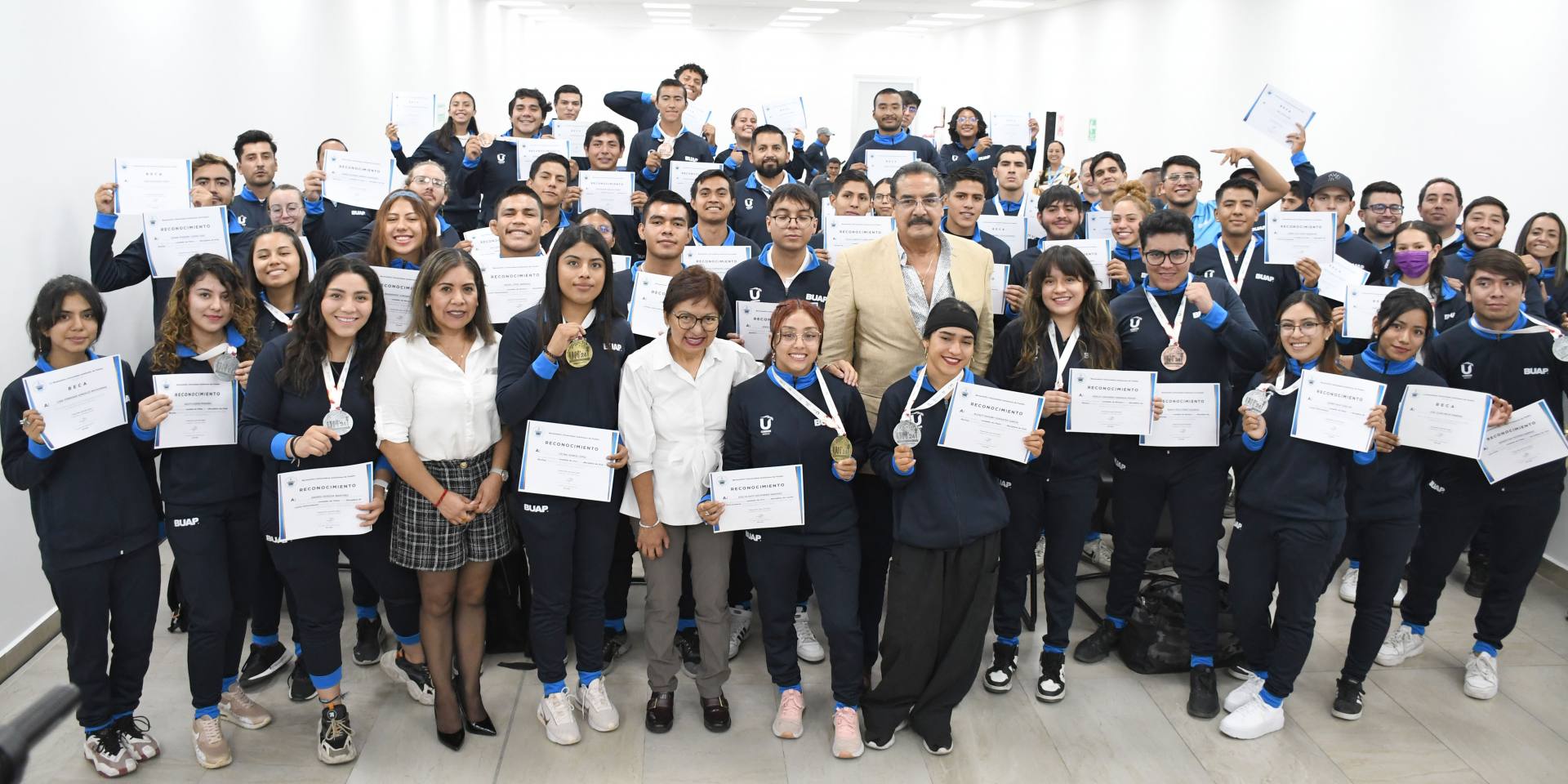 Estudiantes BUAP que participaron en la Universiada Nacional 2024, celebrada en Aguascalientes, fueron reconocidos por la Rectora María Lilia Cedillo Ramírez, quien entregó de manera simbólica 21 de 291 estímulos económicos, para quienes con esfuerzo y dedicación representaron a la universidad en esta competencia donde se enfrentaron a jóvenes de todo el país, en 30 disciplinas deportivas.