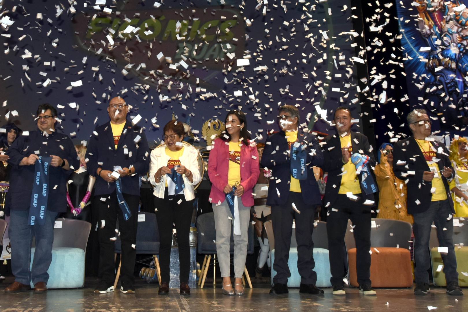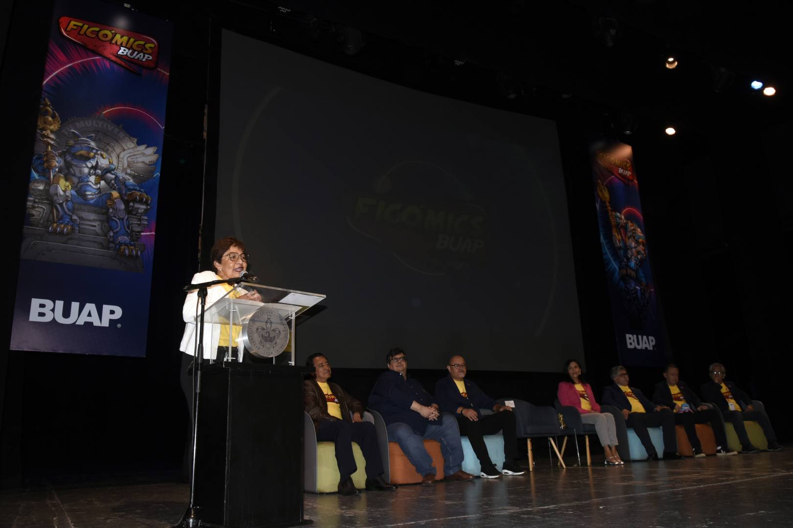 En la inauguración de Ficómics 2024 acompañaron a la Rectora de la BUAP, los vicerrectores de Docencia, Investigación y Estudios de Posgrado, y de Extensión y Difusión de la Cultura, Jaime Vázquez López, Ygnacio Martínez Laguna y José Carlos Bernal Suárez, respectivamente; así como la investigadora de los cómics, de la UAM-Xochimilco, Laura Nallely Hernández Nieto; el académico de la Universidad de Valencia, Álvaro Pons; y el creador de la imagen de Ficómics BUAP 2024, Raúl Cruz Figueroa.