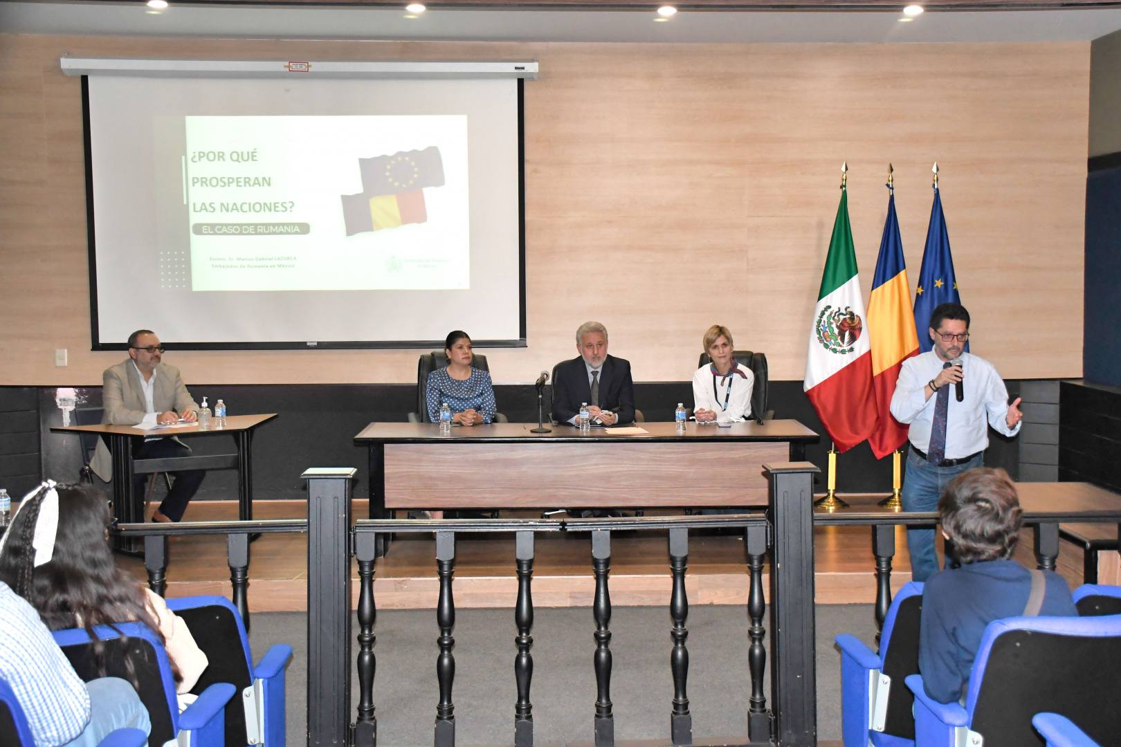 “¿Por qué prosperan las naciones? El caso de Rumania” fue el título de la conferencia que impartió el embajador de este país en México, Marius Gabriel Lazurca, ante estudiantes de la carrera de Relaciones Internacionales, de la Facultad de Ciencias Políticas y Sociales de la BUAP, en la que expuso la transición del modelo político y económico, para pasar de ser una nación subdesarrollada a desarrollada en los últimos 30 años.