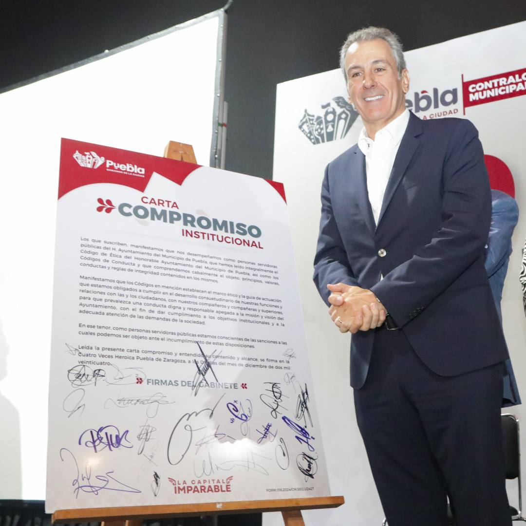 Las y los funcionarios del Gobierno de la Ciudad así como regidoras y regidores firmaron una carta compromiso institucional en la que afirman que cumplirán Código de Ética del Ayuntamiento de Puebla, así como los Códigos de Conducta y que comprenden cabalmente el objeto, principios, valores, conductas y reglas de integridad contenidos en los mismos.