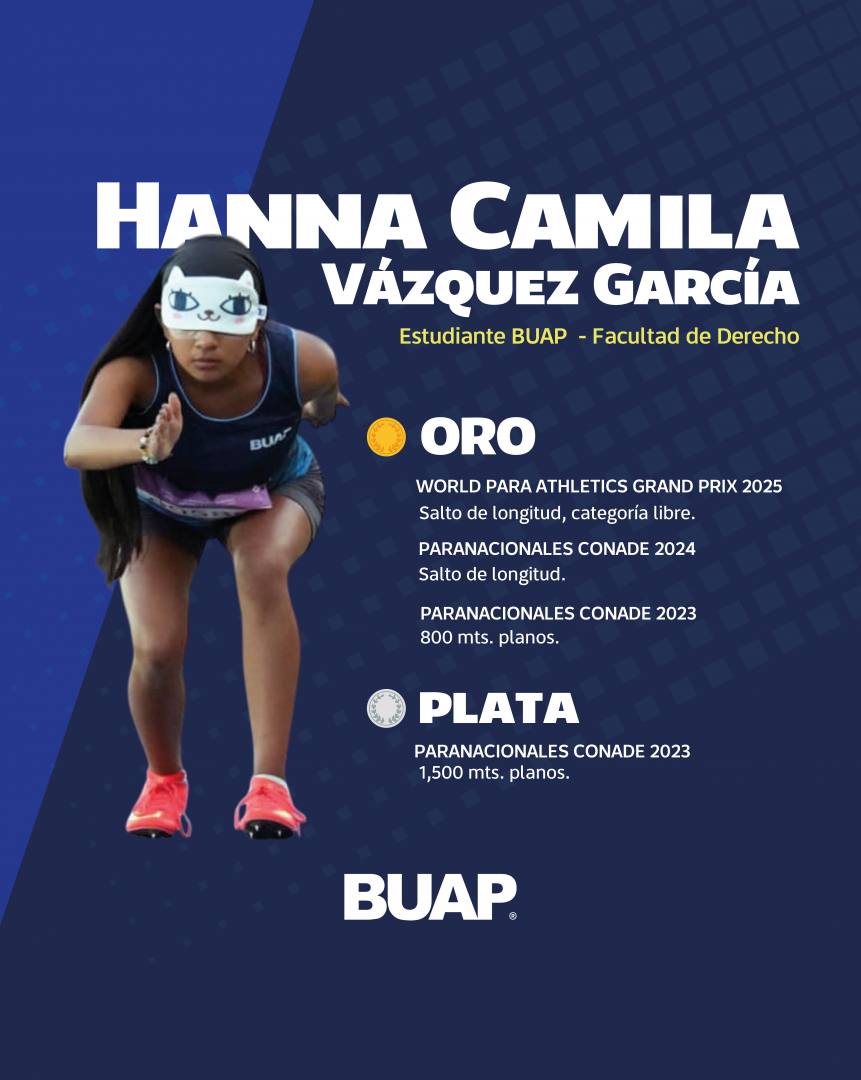 Ella es Hanna Camila Vázquez García, egresada de la Preparatoria Emiliano Zapata, en San Martín Texmelucan y estudiante de la Facultad de Derecho de la BUAP. Su más reciente logro: medalla de oro en salto de longitud, categoría libre, clasificación T11, en el World Para Athletics Grand Prix - 11° Abierto Mexicano de Para Atletismo, que se llevó a cabo en el Polideportivo CODE Revolución, en Jalisco, del 9 al 12 de mayo pasado, donde logró una marca de 3.61 metros, que superó a la del paranacional de la CONADE (Comisión Nacional de Cultura Física y Deporte) -octubre 2024, en Oaxaca-, donde también ganó el oro con un salto de 3.44 metros, en la categoría Juvenil Mayor Superior.