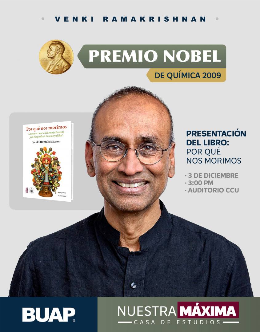 En las últimas décadas, cada vez más la ciencia se acerca al conocimiento sobre los fundamentos del envejecimiento. Para compartir con los universitarios estas reflexiones, Venki Ramakrishnan, Premio Nobel de Química 2009, estará en la BUAP este 3 de diciembre para presentar su libro ¿Por qué morimos? La cita es a las 15:00 horas, en el auditorio del Complejo Cultural Universitario.