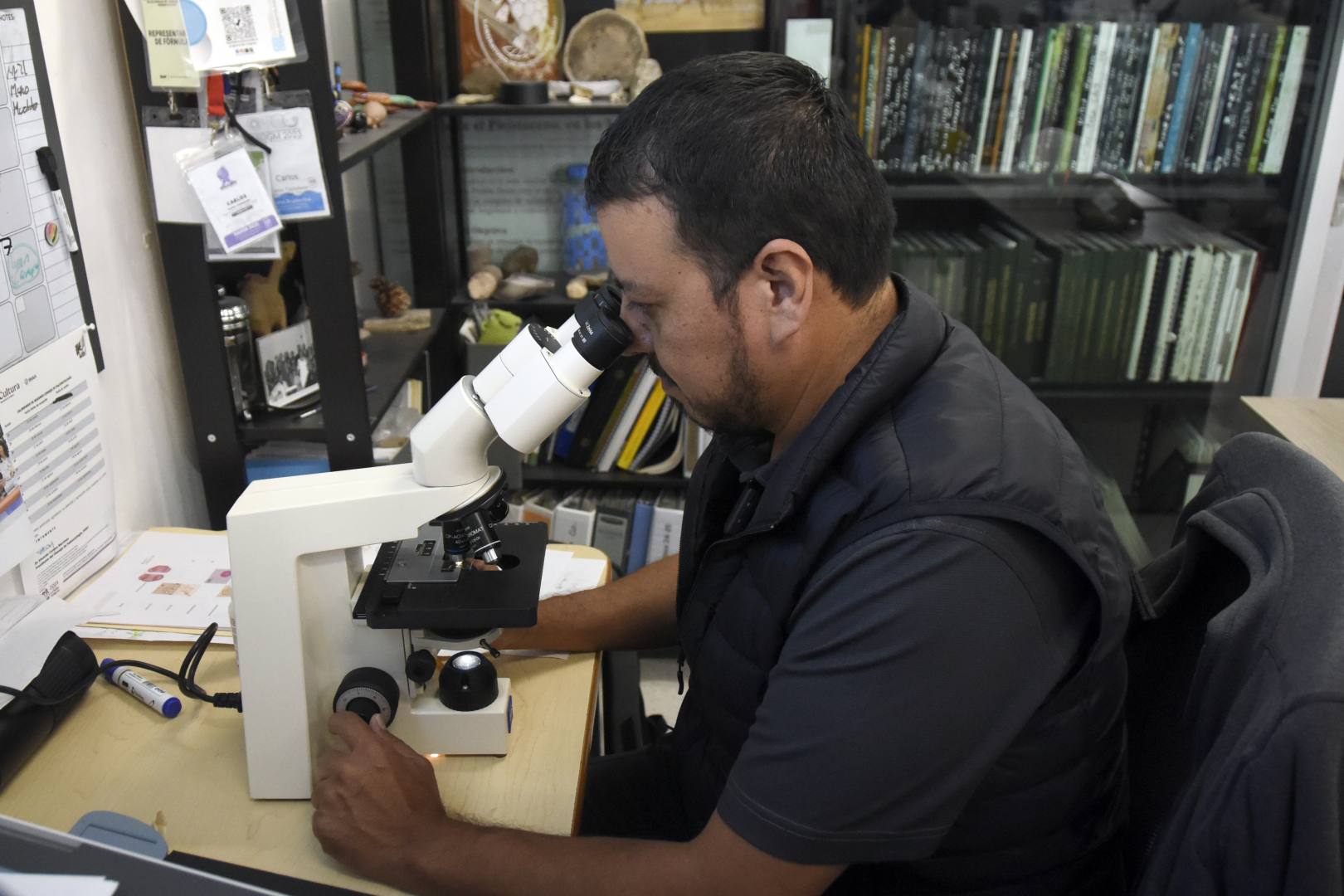 “De los registros fósiles y de los sedimentos de la tierra reconstruimos la vegetación de una zona. Por ejemplo, cada grano de polen es una huella digital de las plantas que existieron, con su identificación y asociación podemos saber qué flora había en la región. Para determinar estas características, lavamos kilos de sedimentos con ácidos para disolver la roca, hasta quedar sólo una pequeña pastilla del tamaño de una lenteja, la cual se analiza a nivel microscópico para identificar los pólenes y saber qué tipo de vegetación era. Aquí encontramos desde pinos, encinos, que nos muestran elementos arbóreos, o bien pastos, hierbas como asteráceas, amarantos o maíz, que hablan de perturbaciones en la vegetación. Cada uno de estos fósiles nos revelan diferentes estructuras vegetales a través del tiempo”.